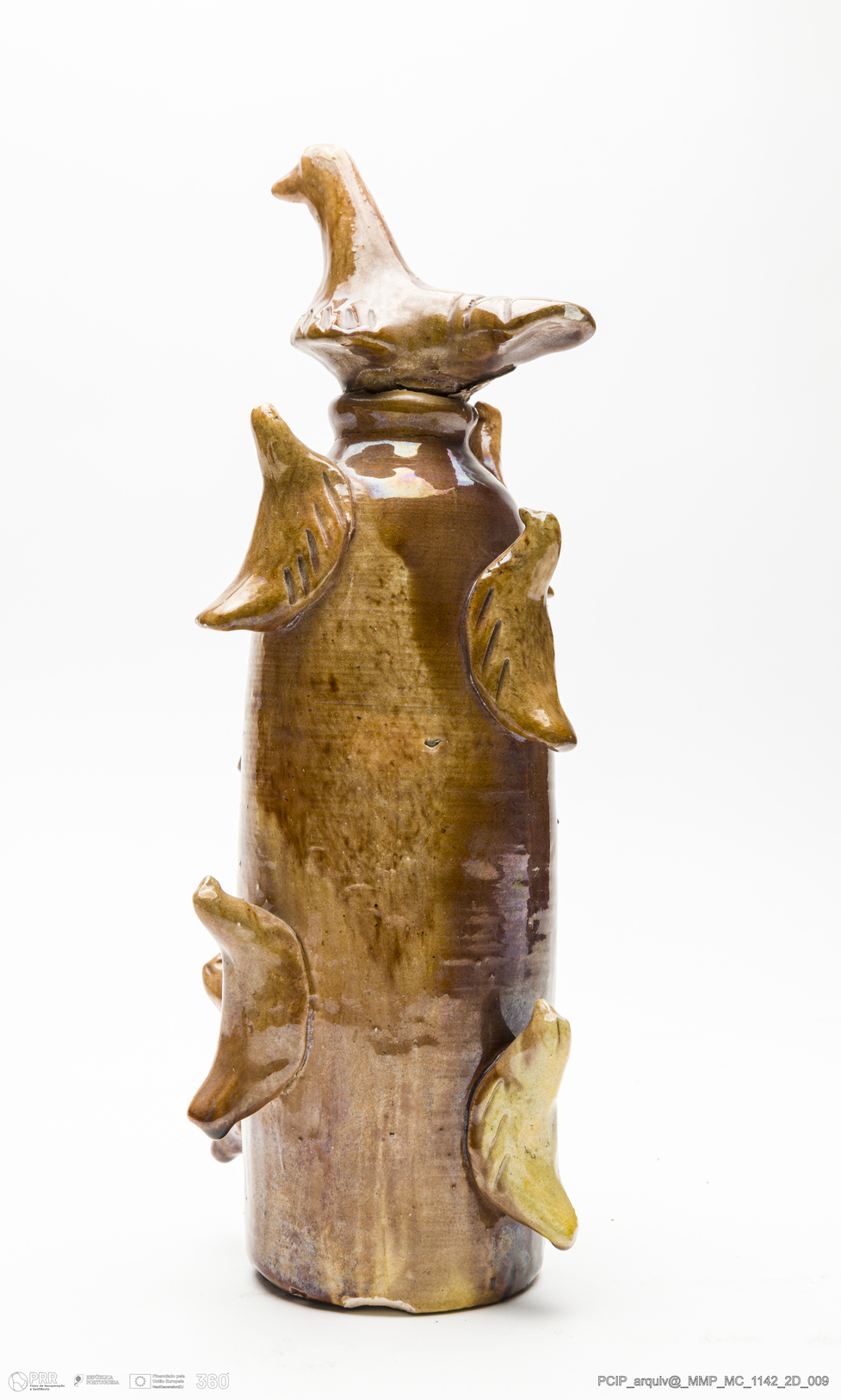 Matéria/Técnica: Barro branco modelado. Vidrado monocromo castanho; Cronologia: século XX; Autoria: Rosa Ramalho; Dimensões (cm): Altura: 27; Largura: 7.