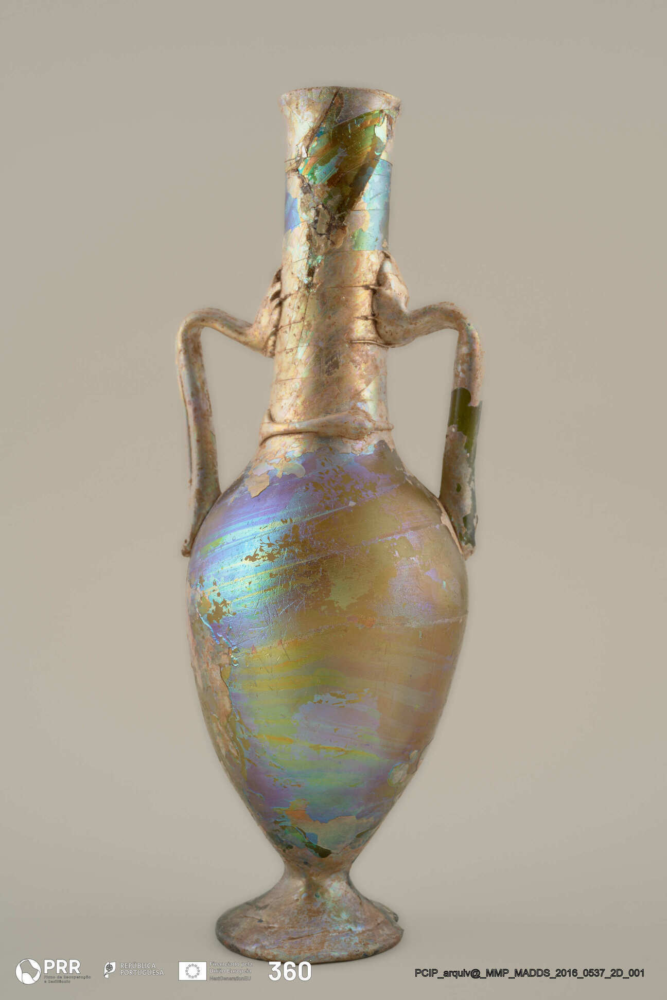 Matéria/Técnica: Vidro; Cronologia: Século V d.C; Autoria: Desconhecida; Dimensões (cm): 25 x 9 x 9.