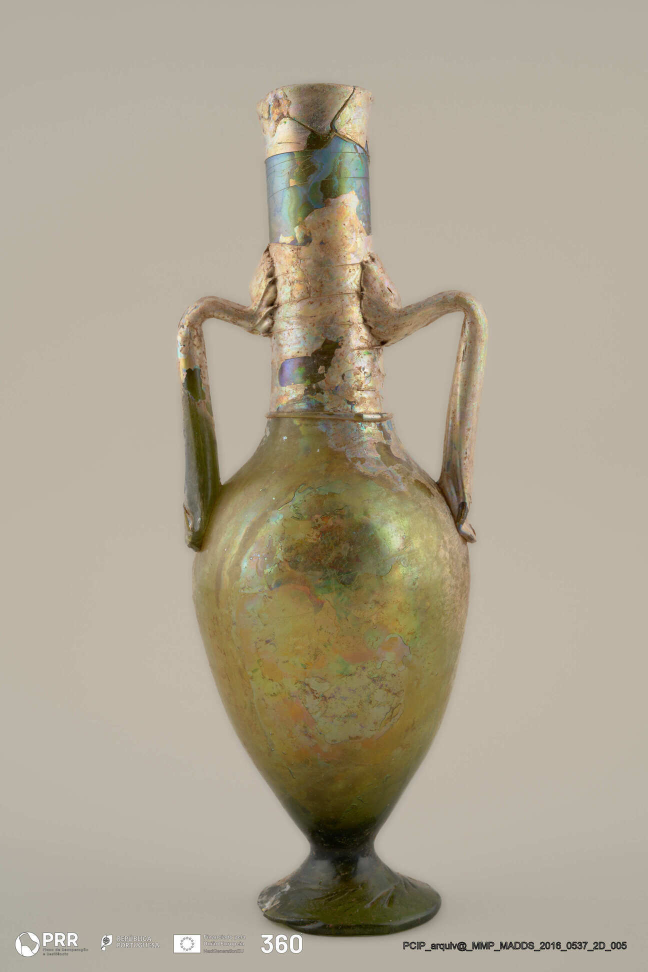 Matéria/Técnica: Vidro; Cronologia: Século V d.C; Autoria: Desconhecida; Dimensões (cm): 25 x 9 x 9.