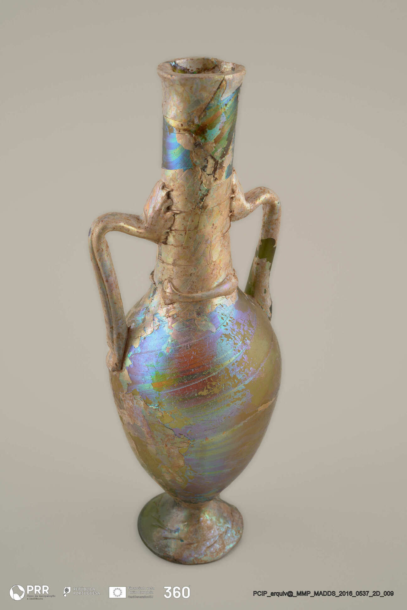 Matéria/Técnica: Vidro; Cronologia: Século V d.C; Autoria: Desconhecida; Dimensões (cm): 25 x 9 x 9.