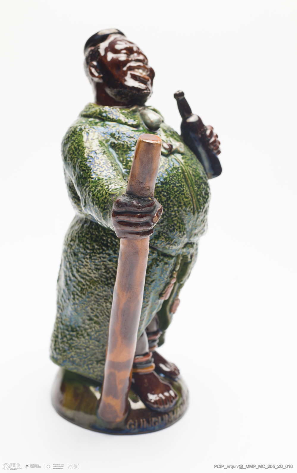 Matéria/Técnica: Barro vermelho modelado e moldado. Vidrado polícromo: verde de cobre, castanho de manganês, amarelo de ferro e branco de estanho; Cronologia: 1902; Autoria: Rafael Bordalo Pinheiro / Fábrica de Faianças das Caldas da Rainha, Portugal; Dimensões (cm): Altura: 24; Largura: 15; Comprimento: 11.