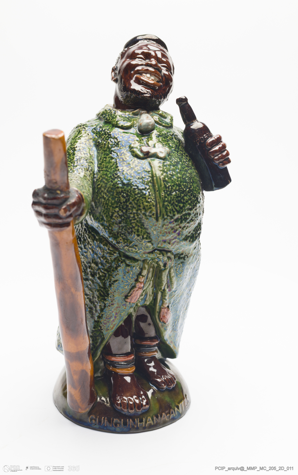 Matéria/Técnica: Barro vermelho modelado e moldado. Vidrado polícromo: verde de cobre, castanho de manganês, amarelo de ferro e branco de estanho; Cronologia: 1902; Autoria: Rafael Bordalo Pinheiro / Fábrica de Faianças das Caldas da Rainha, Portugal; Dimensões (cm): Altura: 24; Largura: 15; Comprimento: 11.