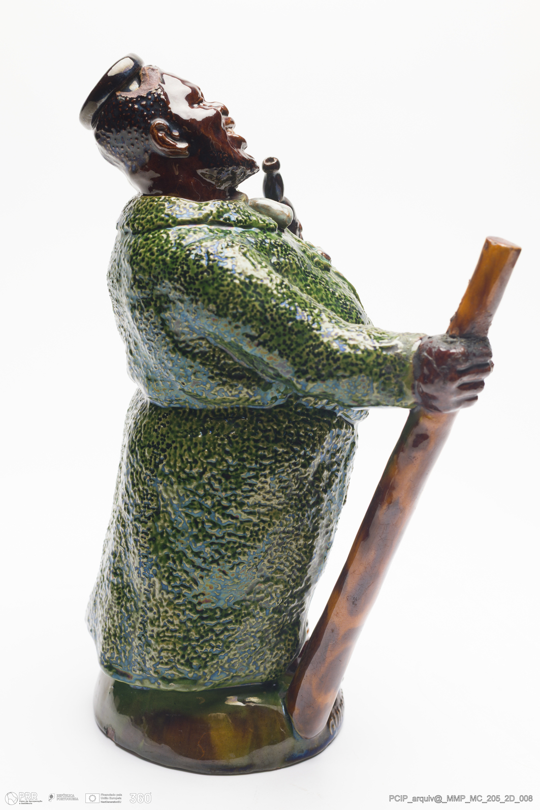 Matéria/Técnica: Barro vermelho modelado e moldado. Vidrado polícromo: verde de cobre, castanho de manganês, amarelo de ferro e branco de estanho; Cronologia: 1902; Autoria: Rafael Bordalo Pinheiro / Fábrica de Faianças das Caldas da Rainha, Portugal; Dimensões (cm): Altura: 24; Largura: 15; Comprimento: 11.