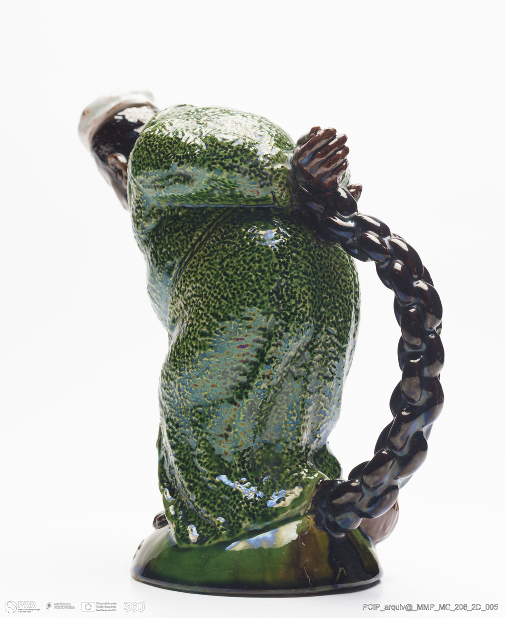 Matéria/Técnica: Barro vermelho moldado e modelado. Vidrado polícromo: amarelo, castanho, vermelho e verde; Cronologia: 1902; Autoria: Rafael Bordalo Pinheiro / Fábrica de Faianças das Caldas da Rainha, Portugal; Dimensões (cm): Altura: 21,5; Largura: 11; Comprimento: 20.