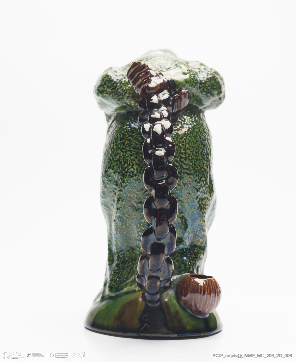 Matéria/Técnica: Barro vermelho moldado e modelado. Vidrado polícromo: amarelo, castanho, vermelho e verde; Cronologia: 1902; Autoria: Rafael Bordalo Pinheiro / Fábrica de Faianças das Caldas da Rainha, Portugal; Dimensões (cm): Altura: 21,5; Largura: 11; Comprimento: 20.