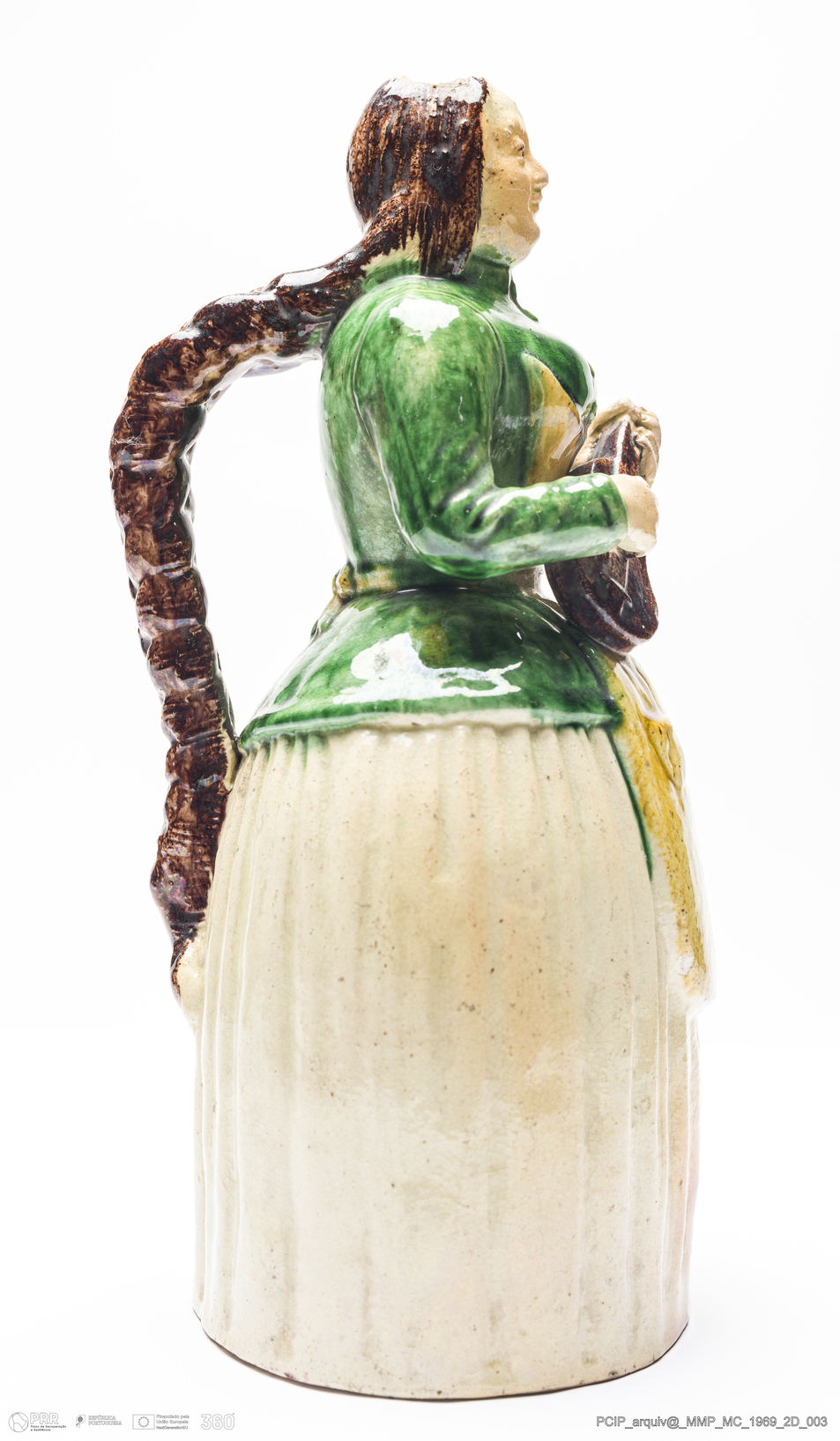 Matéria/Técnica: Barro moldado e modelado. Vidrado polícromo: castanha escuro e mel, verde e amarelo; Cronologia: 1870-1887; Autoria: Manuel Cipriano Gomes Mafra / Fábrica de Manuel Cipriano Gomes O Mafra, Caldas da Rainha, Portugal; Dimensões (cm): Altura: 28,5; Largura: 14,5; Comprimento: 15.