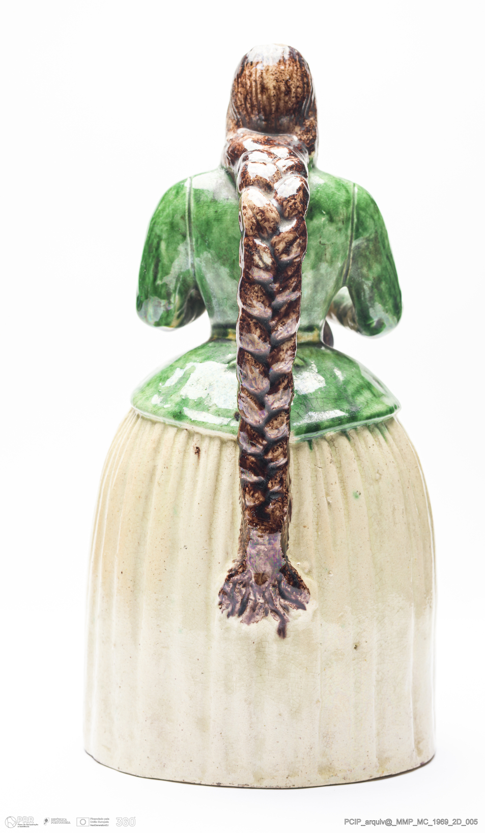 Matéria/Técnica: Barro moldado e modelado. Vidrado polícromo: castanha escuro e mel, verde e amarelo; Cronologia: 1870-1887; Autoria: Manuel Cipriano Gomes Mafra / Fábrica de Manuel Cipriano Gomes O Mafra, Caldas da Rainha, Portugal; Dimensões (cm): Altura: 28,5; Largura: 14,5; Comprimento: 15.