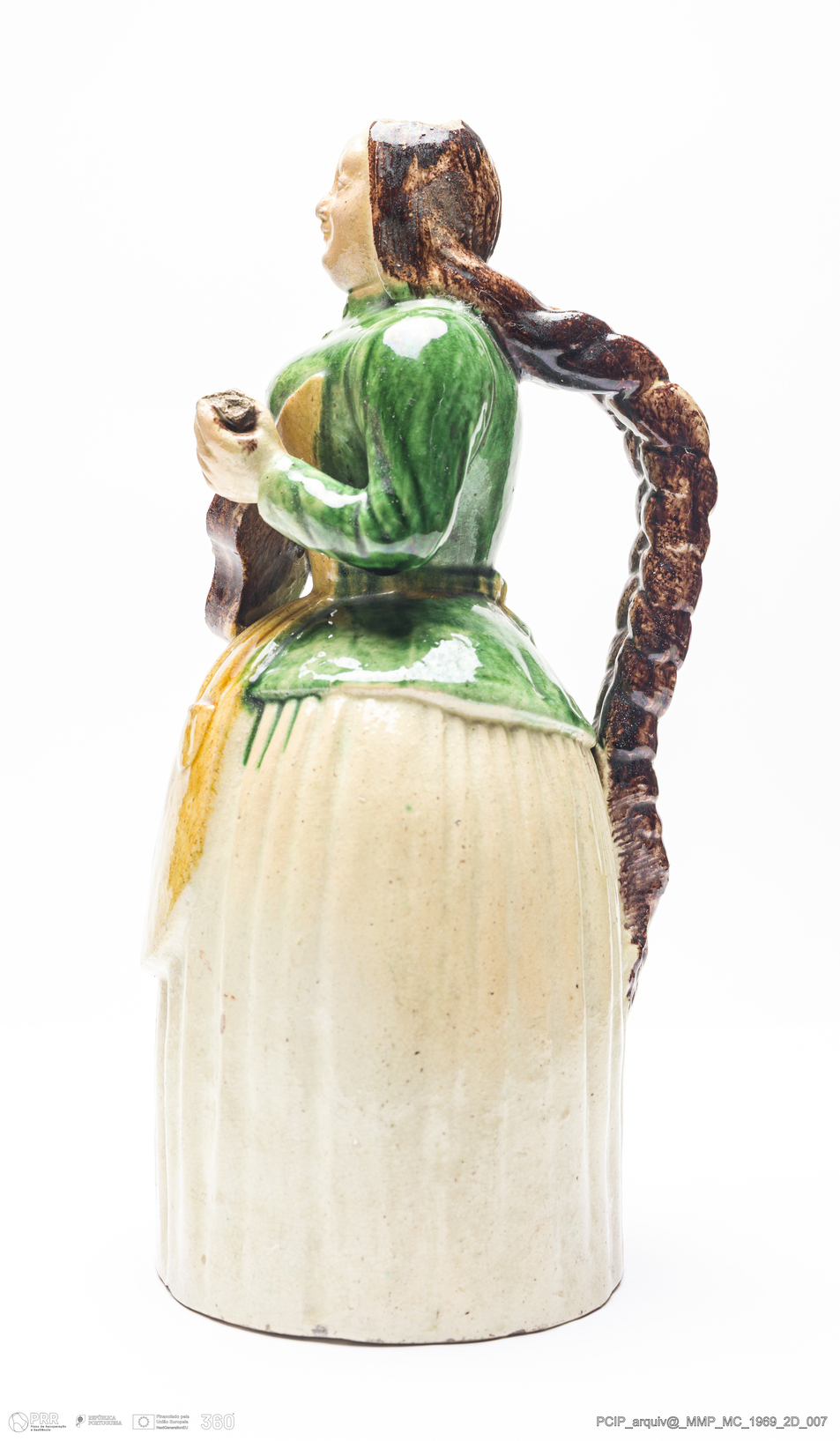 Matéria/Técnica: Barro moldado e modelado. Vidrado polícromo: castanha escuro e mel, verde e amarelo; Cronologia: 1870-1887; Autoria: Manuel Cipriano Gomes Mafra / Fábrica de Manuel Cipriano Gomes O Mafra, Caldas da Rainha, Portugal; Dimensões (cm): Altura: 28,5; Largura: 14,5; Comprimento: 15.
