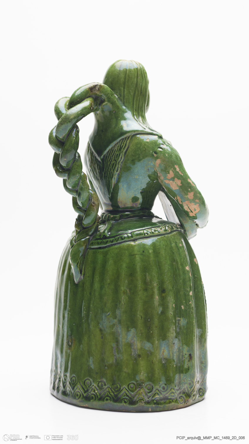 Matéria/Técnica: Barro vermelho modelado e moldado. Vidrado verde de cobre; Cronologia: 1820-1853; Autoria: Maria dos Cacos / Atr. Oficina de Maria dos Cacos, Caldas da Rainha; Dimensões (cm): Altura: 22,6; Largura: 11,2; Comprimento: 11,3.