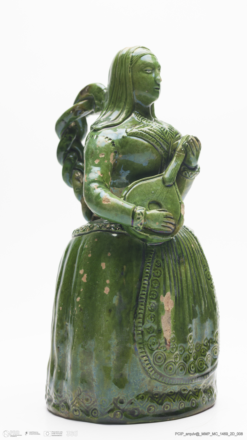 Matéria/Técnica: Barro vermelho modelado e moldado. Vidrado verde de cobre; Cronologia: 1820-1853; Autoria: Maria dos Cacos / Atr. Oficina de Maria dos Cacos, Caldas da Rainha; Dimensões (cm): Altura: 22,6; Largura: 11,2; Comprimento: 11,3.