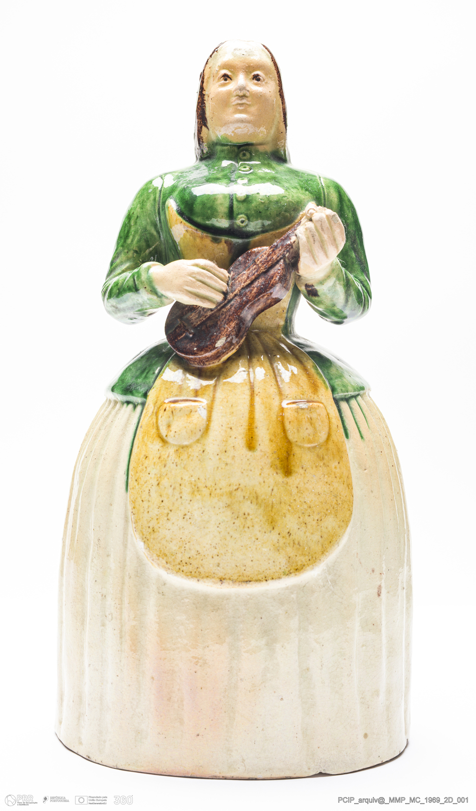 Matéria/Técnica: Barro moldado e modelado. Vidrado polícromo: castanha escuro e mel, verde e amarelo; Cronologia: 1870-1887; Autoria: Manuel Cipriano Gomes Mafra / Fábrica de Manuel Cipriano Gomes O Mafra, Caldas da Rainha, Portugal; Dimensões (cm): Altura: 28,5; Largura: 14,5; Comprimento: 15.