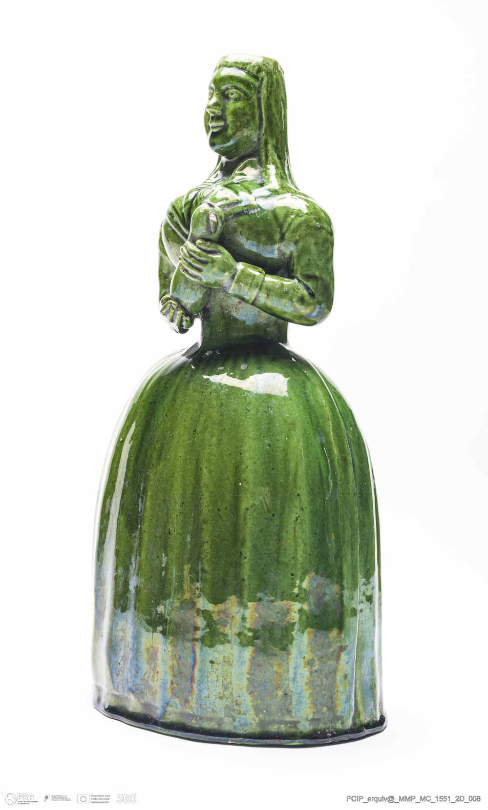 Matéria/Técnica: Barro vermelho moldado. Vidrado verde; Cronologia: 1820-1853; Autoria: Maria dos Cacos / Atr. Oficina de Maria dos Cacos, Caldas da Rainha; Dimensões (cm): Altura: 30; Largura: 16; Comprimento: 14.
