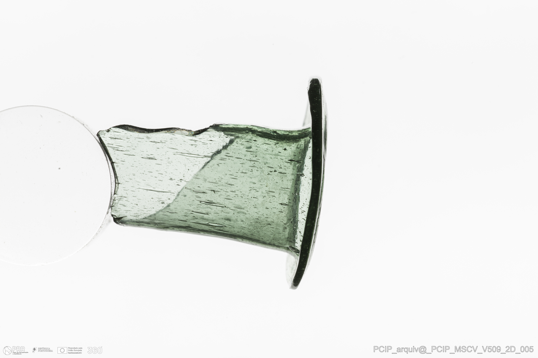 Matéria/Técnica: Vidro; Cronologia: Século XVII; Autoria: Desconhecida; Dimensões: Diâmetro Bordo: 28mm.