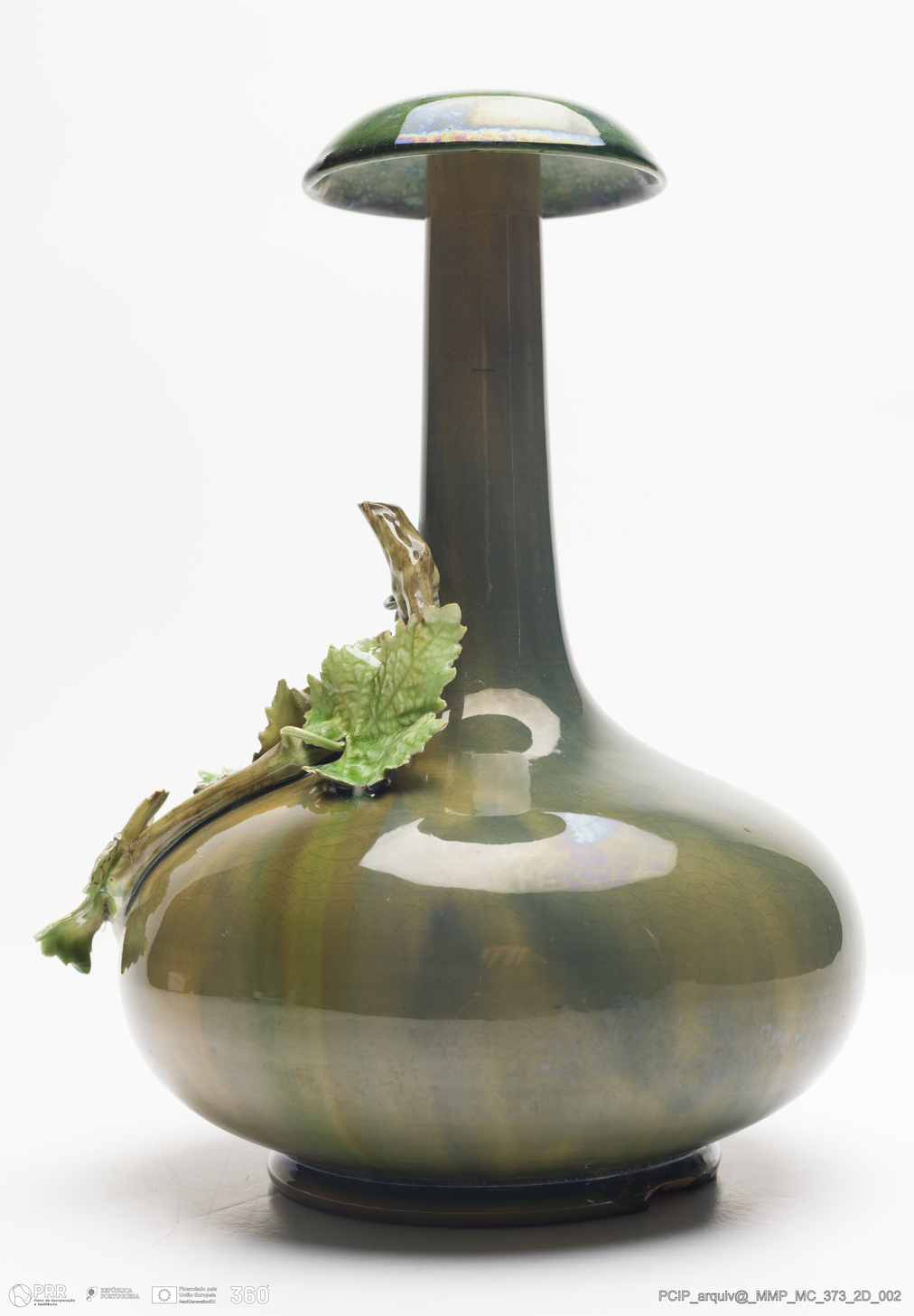 Matéria/Técnica: Barro vermelho modelado e moldado. Vidrado polícromo: verde de cobre e castanho manganês; Cronologia: 1884-1905; Autoria: Rafael Bordalo Pinheiro / Fábrica de Faianças das Caldas da Rainha, Portugal; Dimensões (cm): Altura: 27; Largura: 15.