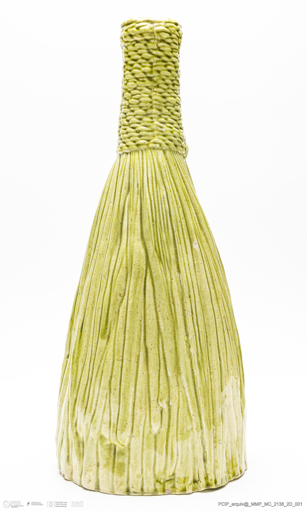 Matéria/Técnica: Barro branco moldado. Vidrado monocromo camurça; Cronologia: 1902-1925; Autoria: Desconhecido / Caldas da Rainha, Portugal; Dimensões (cm): Altura: 34,5; Diâmetro: 15,5.