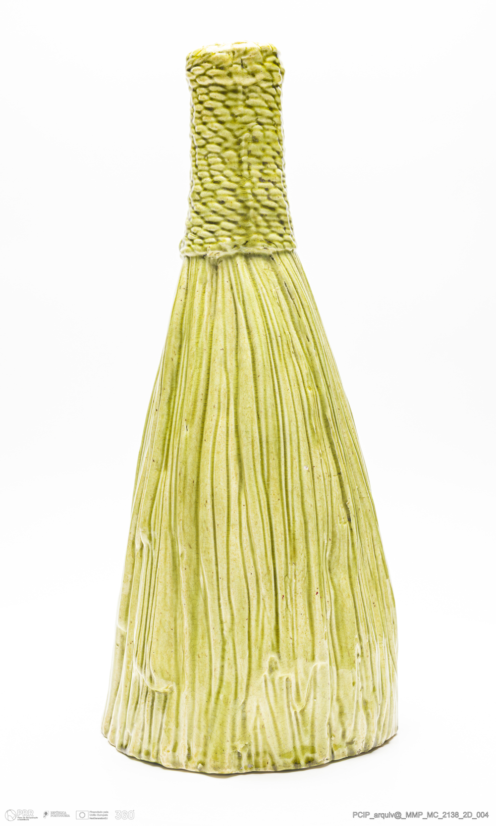 Matéria/Técnica: Barro branco moldado. Vidrado monocromo camurça; Cronologia: 1902-1925; Autoria: Desconhecido / Caldas da Rainha, Portugal; Dimensões (cm): Altura: 34,5; Diâmetro: 15,5.