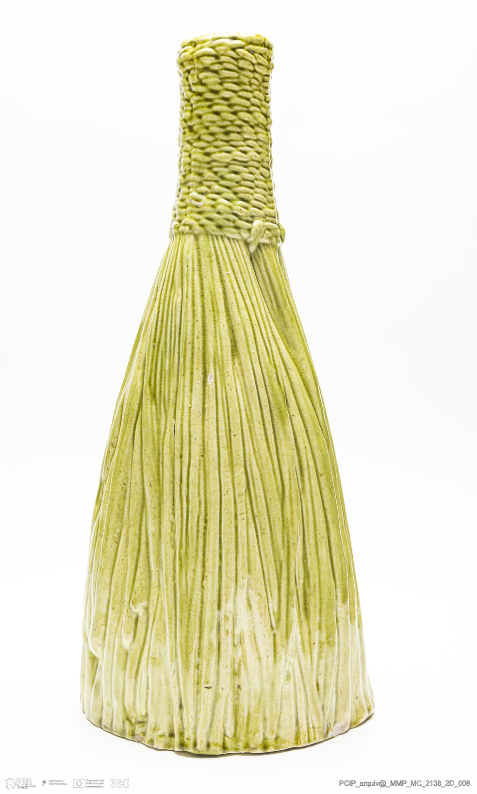 Matéria/Técnica: Barro branco moldado. Vidrado monocromo camurça; Cronologia: 1902-1925; Autoria: Desconhecido / Caldas da Rainha, Portugal; Dimensões (cm): Altura: 34,5; Diâmetro: 15,5.