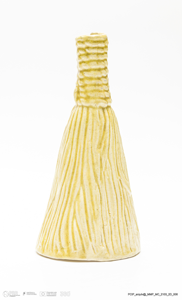 Matéria/Técnica: Barro branco moldado. Vidrado monocromo camurça; Cronologia: 1902-1925; Autoria: António Alves Cunha / Fábrica de António Alves Cunha, Caldas da Rainha, Portugal; Dimensões (cm): Altura: 13,7; Diâmetro: 6,6.