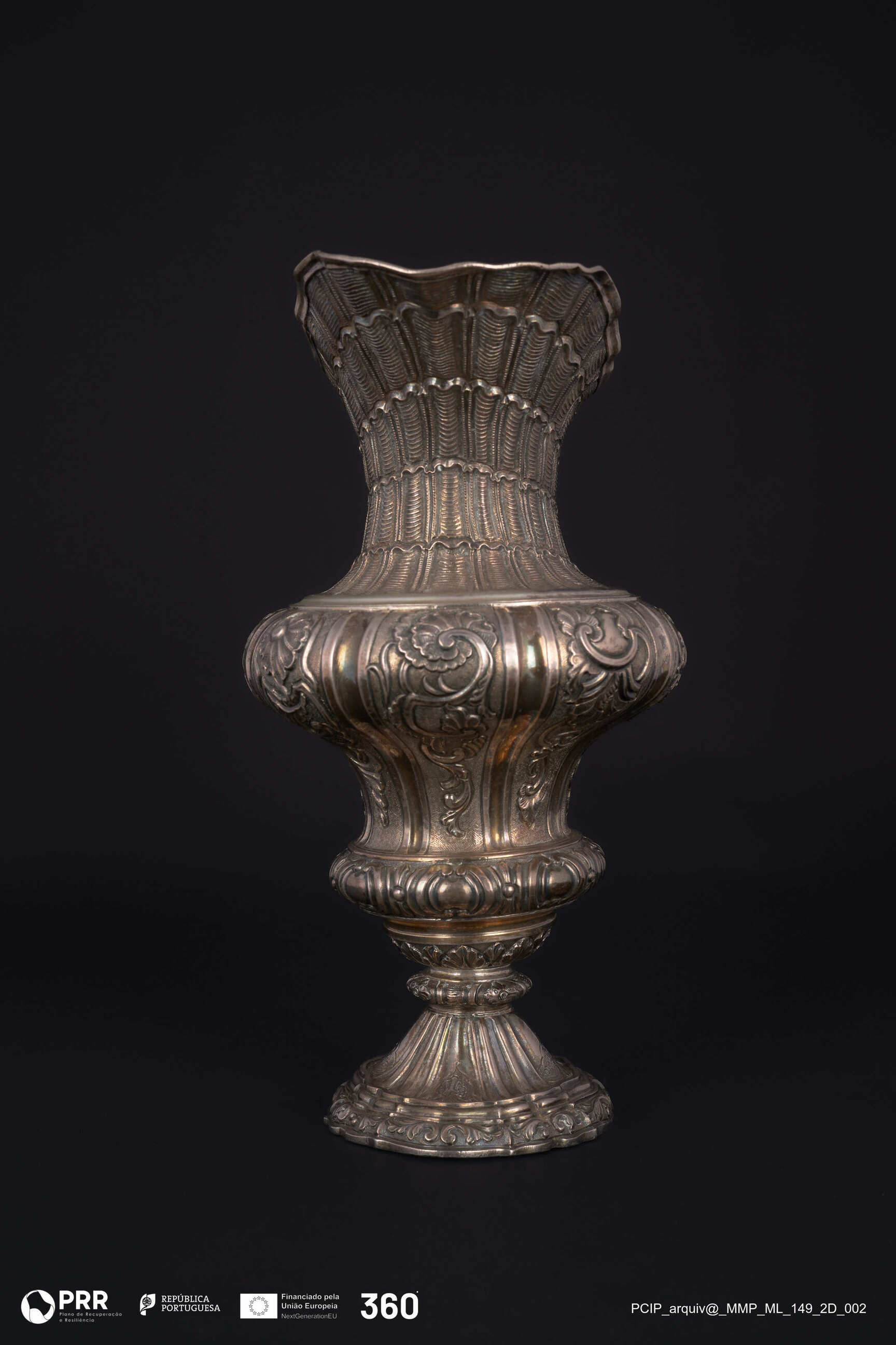 Matéria/Técnica: Relevada, incisa, fundida e cinzelada; Cronologia: 1720-1750; Autoria: A.M (atribuível a António Martins de Almeida); Dimensões (cm): Altura: 27,7 x Largura: 11 x Diâmetro: 9.