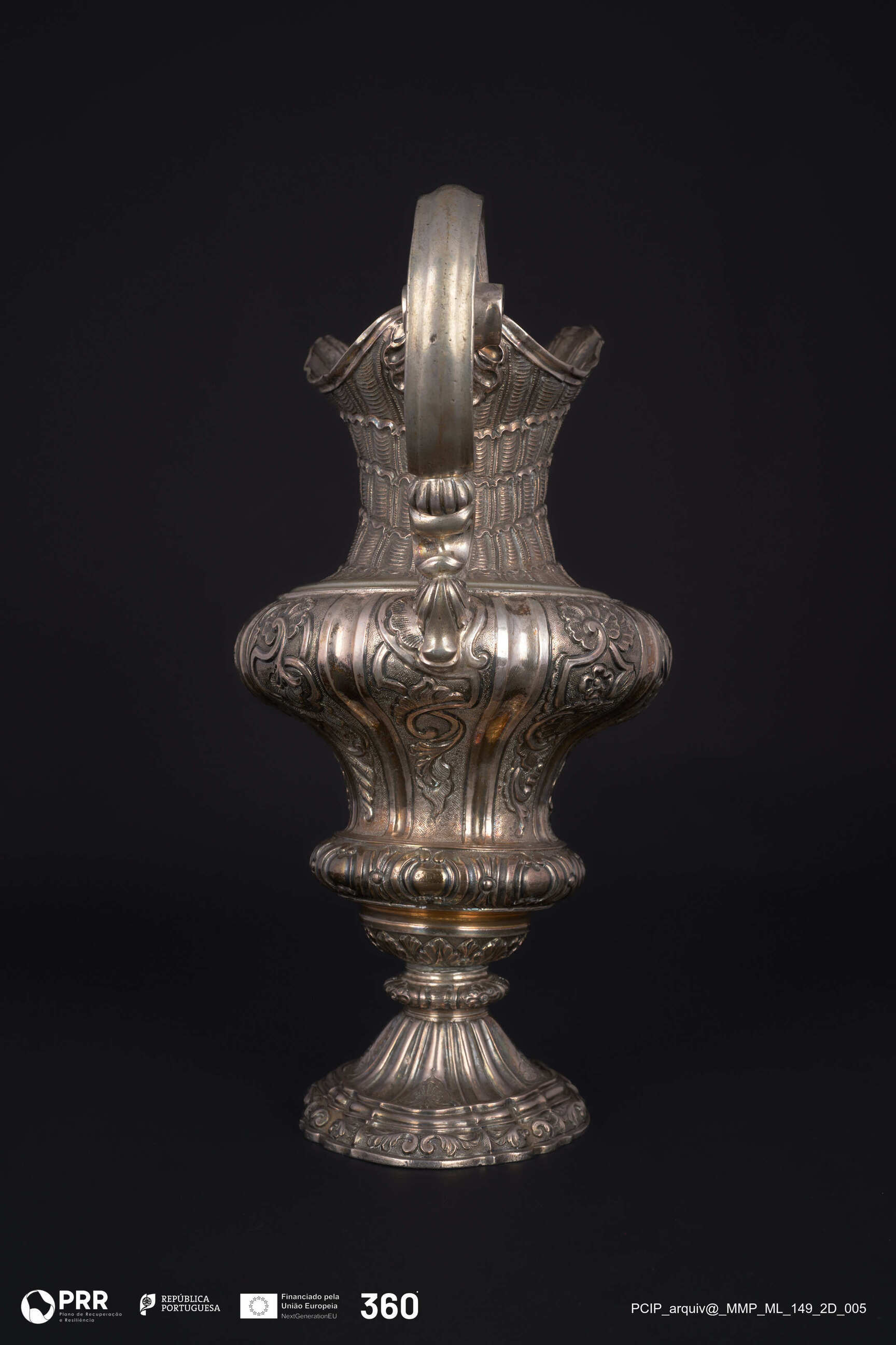 Matéria/Técnica: Relevada, incisa, fundida e cinzelada; Cronologia: 1720-1750; Autoria: A.M (atribuível a António Martins de Almeida); Dimensões (cm): Altura: 27,7 x Largura: 11 x Diâmetro: 9.
