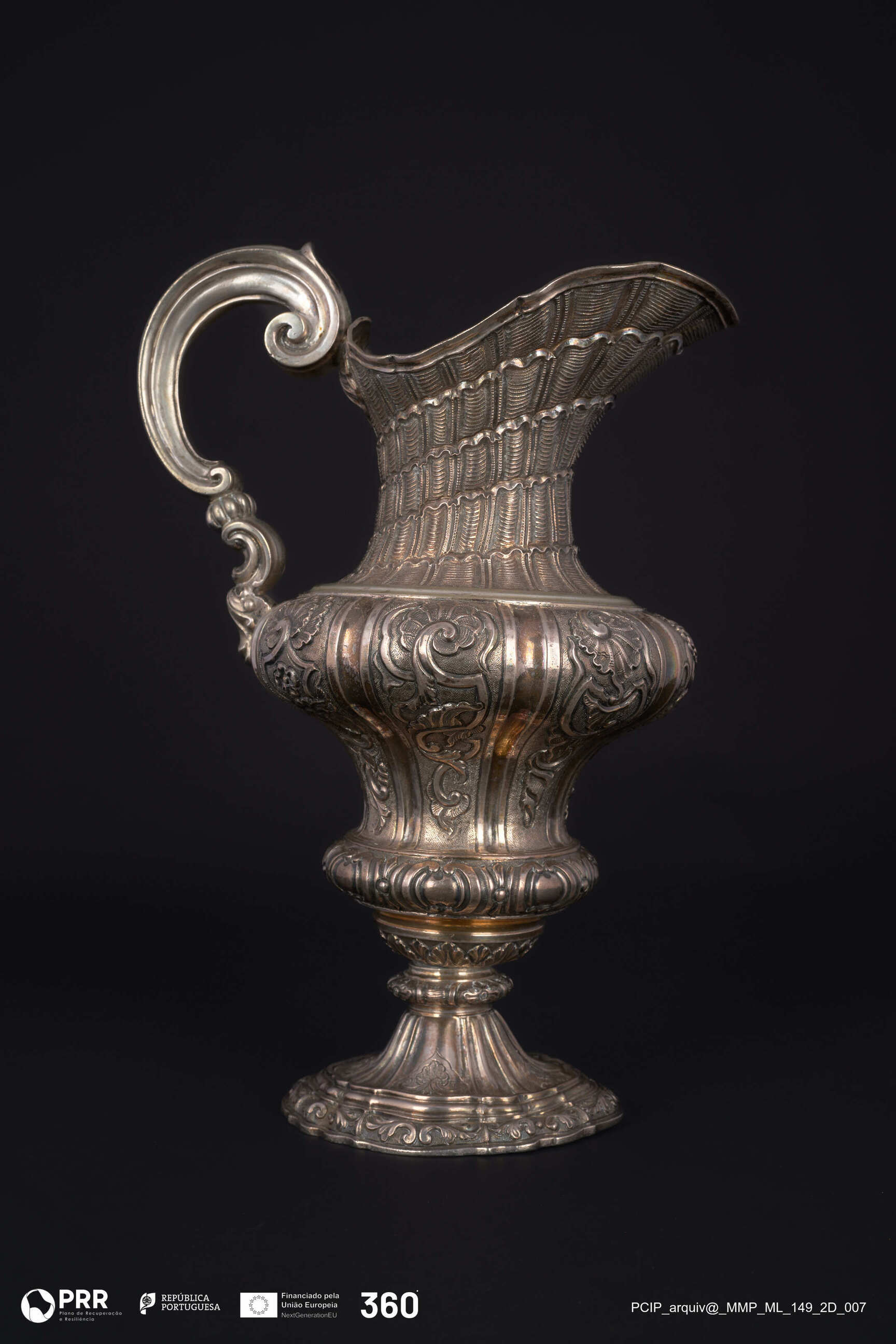 Matéria/Técnica: Relevada, incisa, fundida e cinzelada; Cronologia: 1720-1750; Autoria: A.M (atribuível a António Martins de Almeida); Dimensões (cm): Altura: 27,7 x Largura: 11 x Diâmetro: 9.