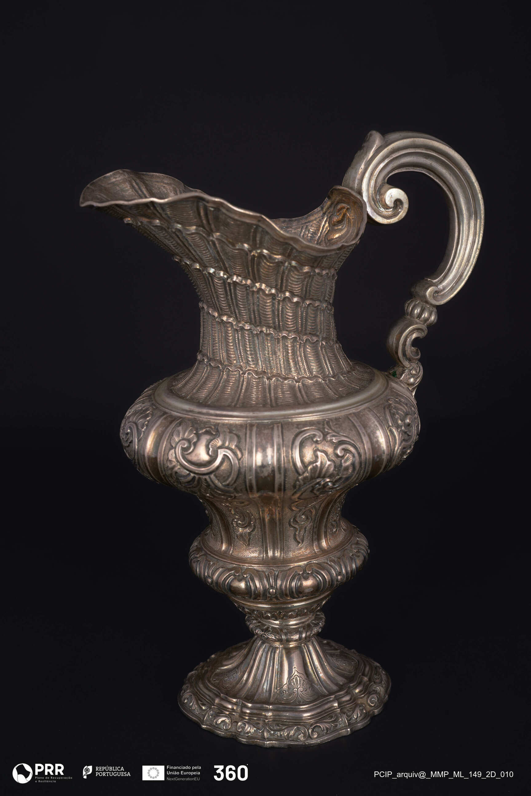 Matéria/Técnica: Relevada, incisa, fundida e cinzelada; Cronologia: 1720-1750; Autoria: A.M (atribuível a António Martins de Almeida); Dimensões (cm): Altura: 27,7 x Largura: 11 x Diâmetro: 9.
