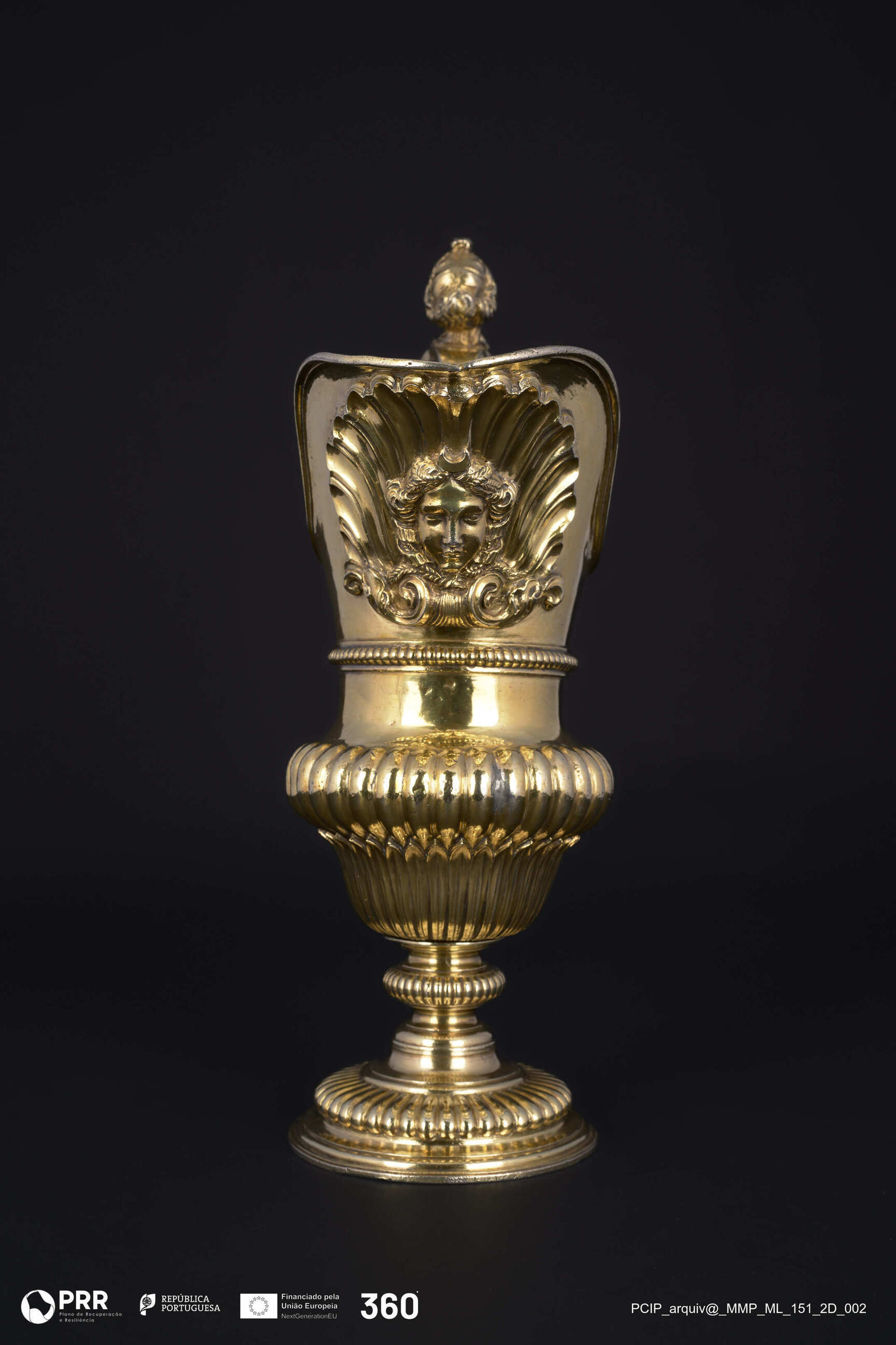 Matéria/Técnica: Dourada e relevada; Cronologia: Século XVII; Autoria: Desconhecida; Dimensões (cm): Altura: 29 x Largura: 18,5 x Diâmetro: (base)9,5.