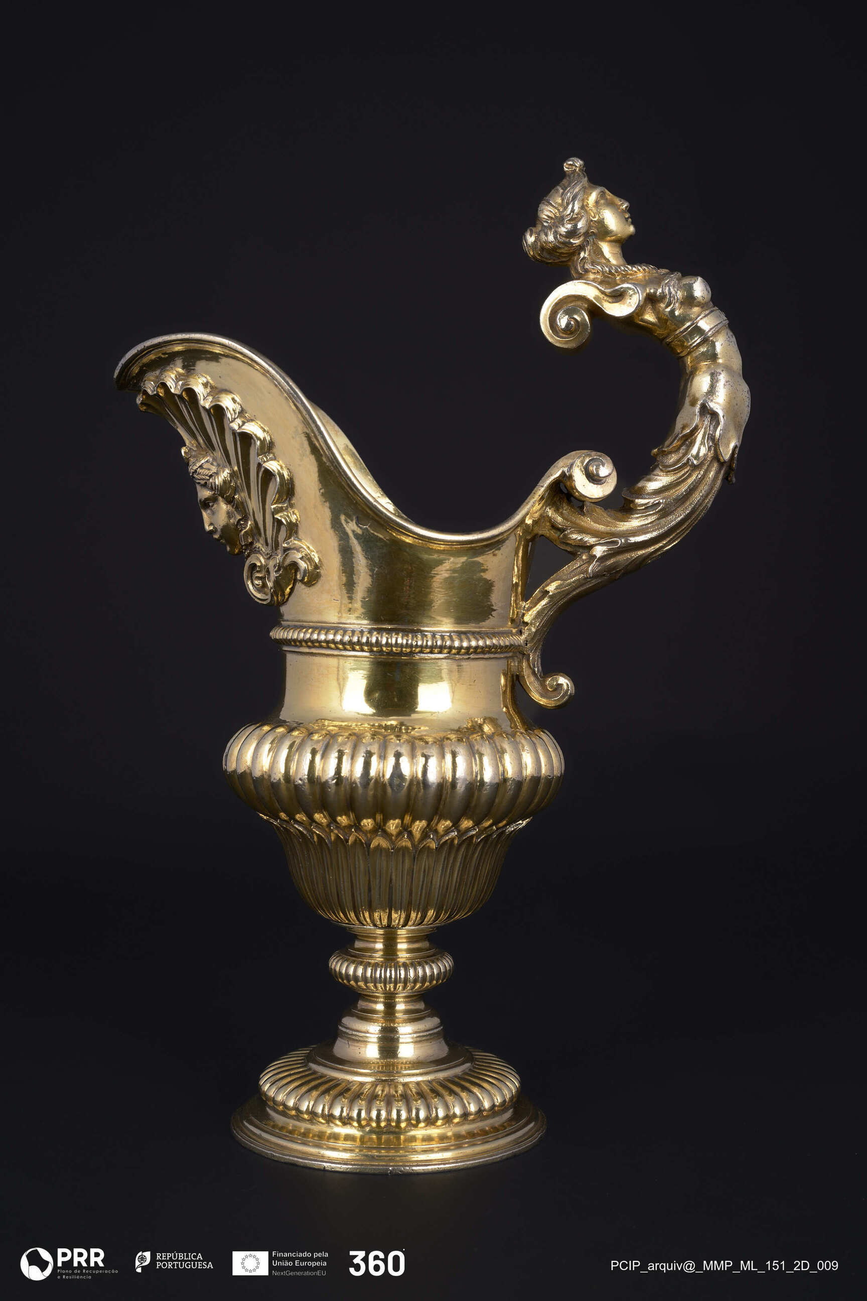 Matéria/Técnica: Dourada e relevada; Cronologia: Século XVII; Autoria: Desconhecida; Dimensões (cm): Altura: 29 x Largura: 18,5 x Diâmetro: (base)9,5.