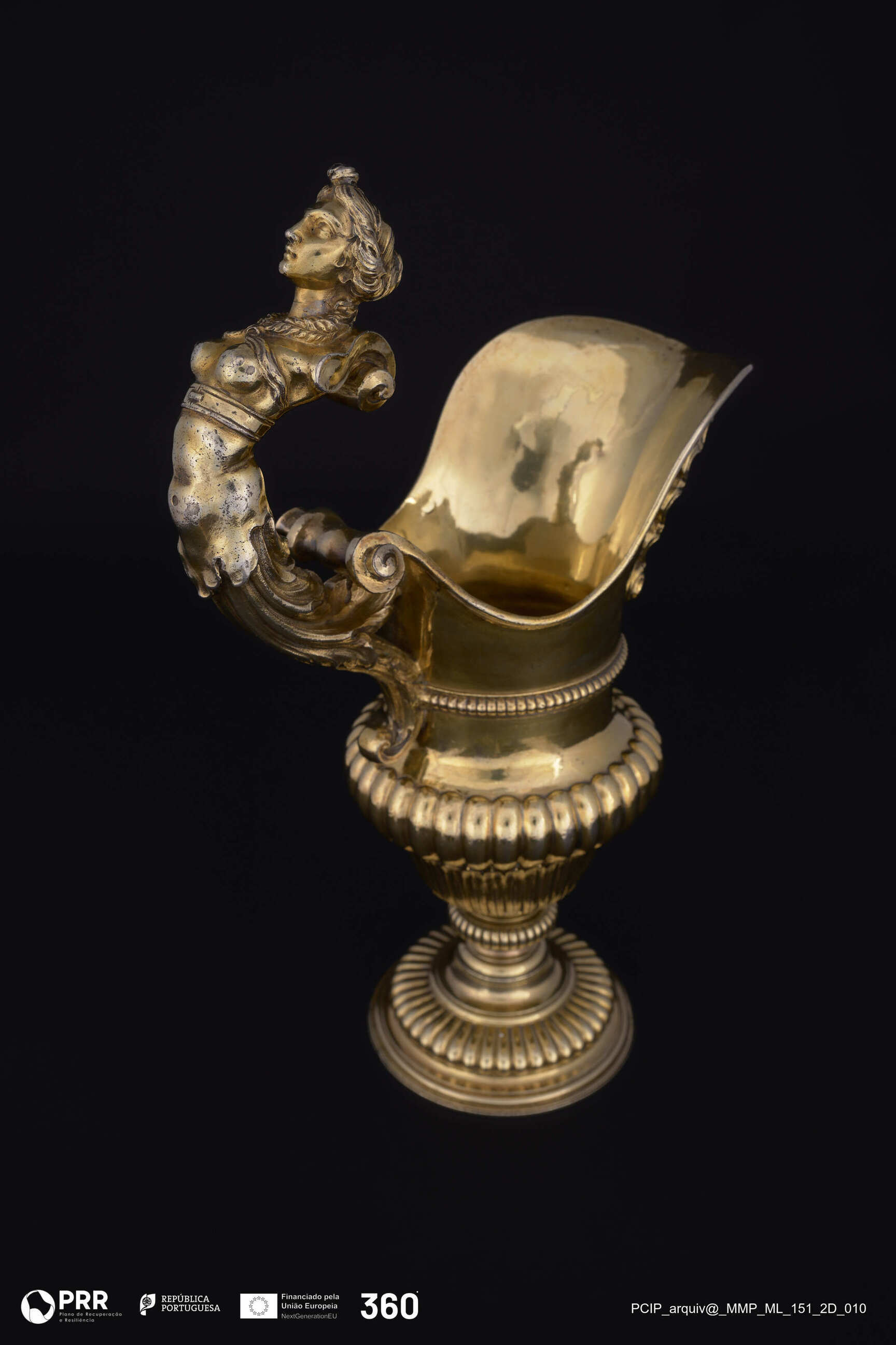 Matéria/Técnica: Dourada e relevada; Cronologia: Século XVII; Autoria: Desconhecida; Dimensões (cm): Altura: 29 x Largura: 18,5 x Diâmetro: (base)9,5.