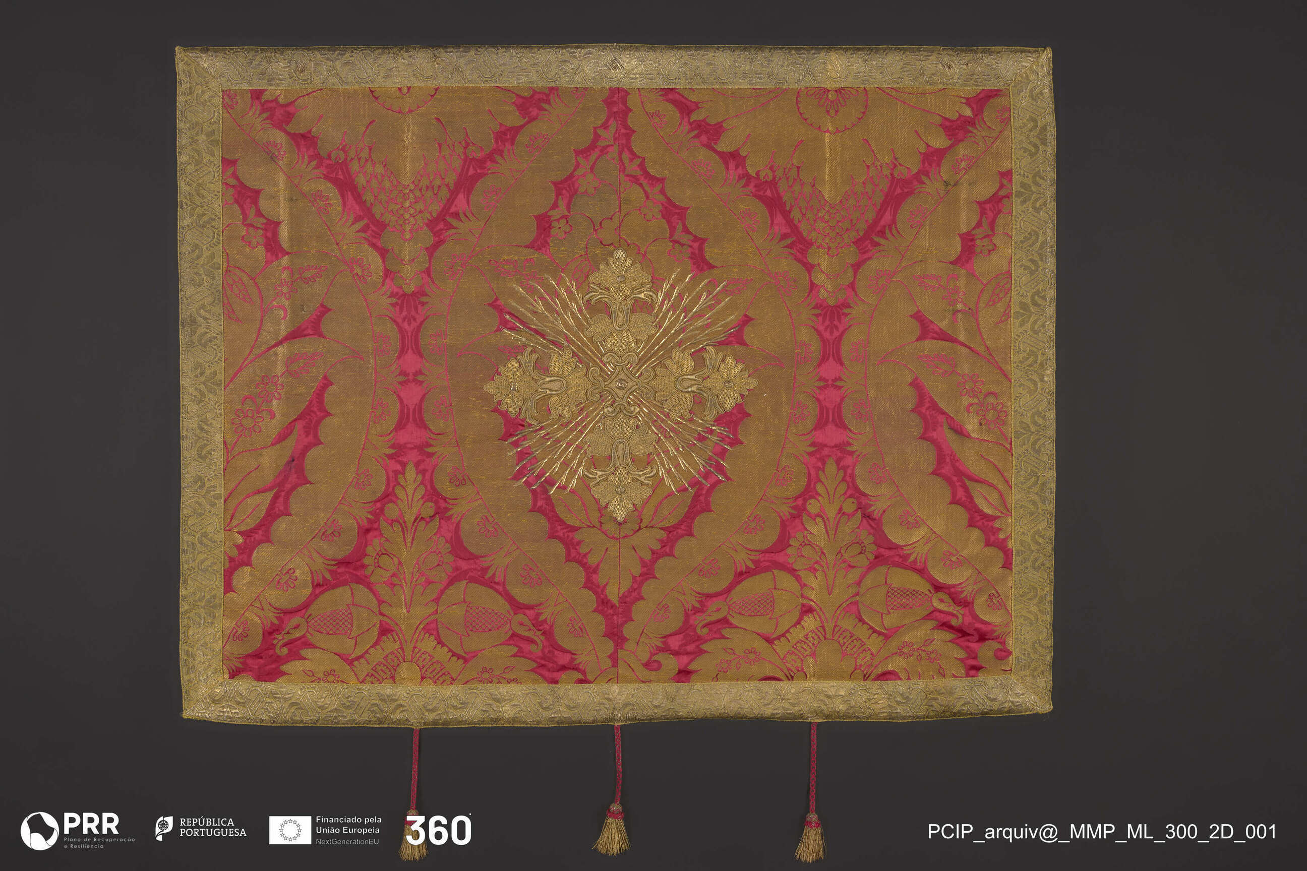 Matéria/Técnica: Bordado sobre enchimento,a pontos de ouro, estendido, encanastrado, com relevo, cordãozinho de várias espessuras, lâmina aplicada sobre cordão (?) Galão largo tecido, fio laminado dourado, a debruar toda a peça, três cordões e borlas de fio de seda vermel; Cronologia: Século XVIII; Autoria: Desconhecida; Dimensões (cm): Altura: 82 x Largura: 108.