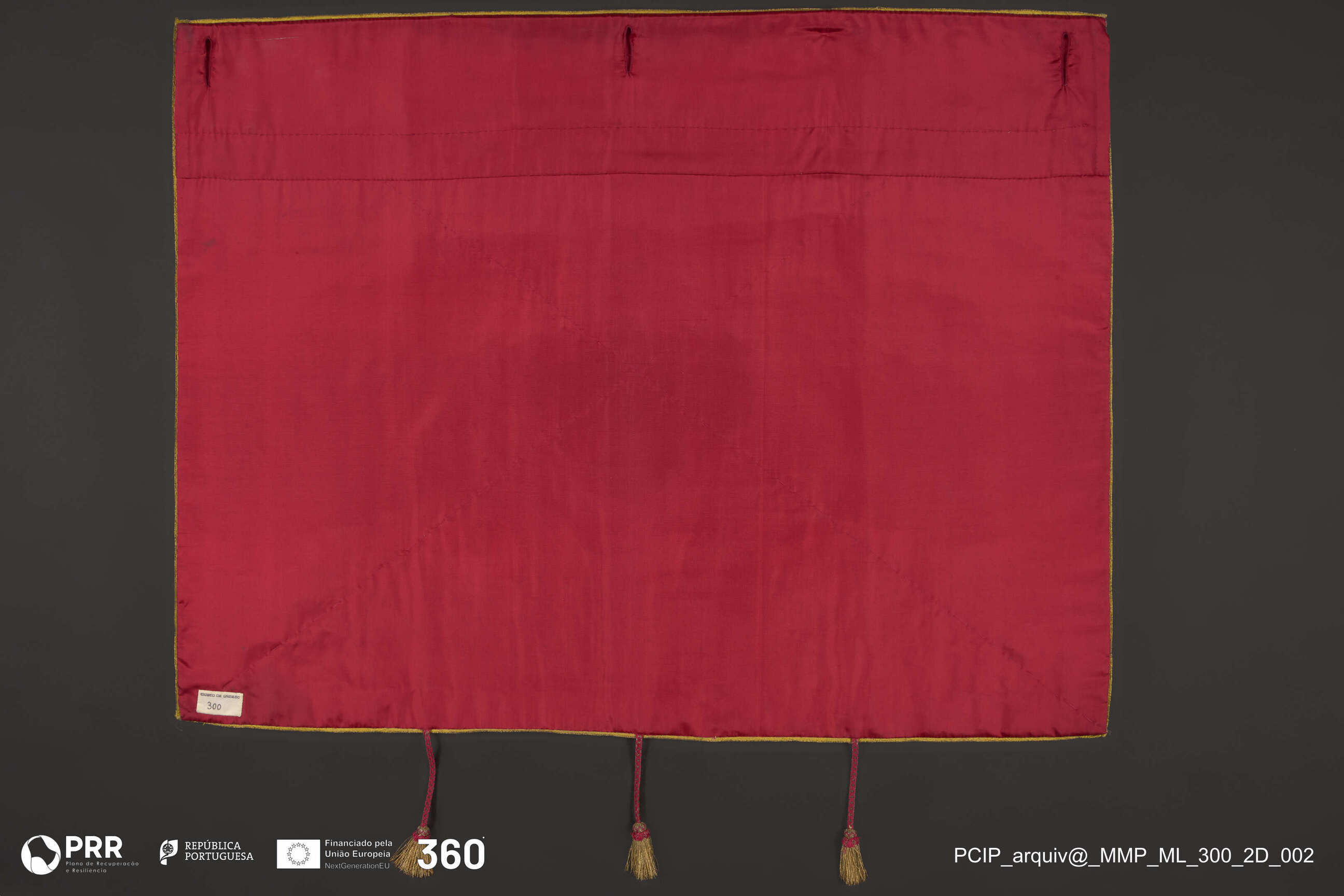 Matéria/Técnica: Bordado sobre enchimento,a pontos de ouro, estendido, encanastrado, com relevo, cordãozinho de várias espessuras, lâmina aplicada sobre cordão (?) Galão largo tecido, fio laminado dourado, a debruar toda a peça, três cordões e borlas de fio de seda vermel; Cronologia: Século XVIII; Autoria: Desconhecida; Dimensões (cm): Altura: 82 x Largura: 108.