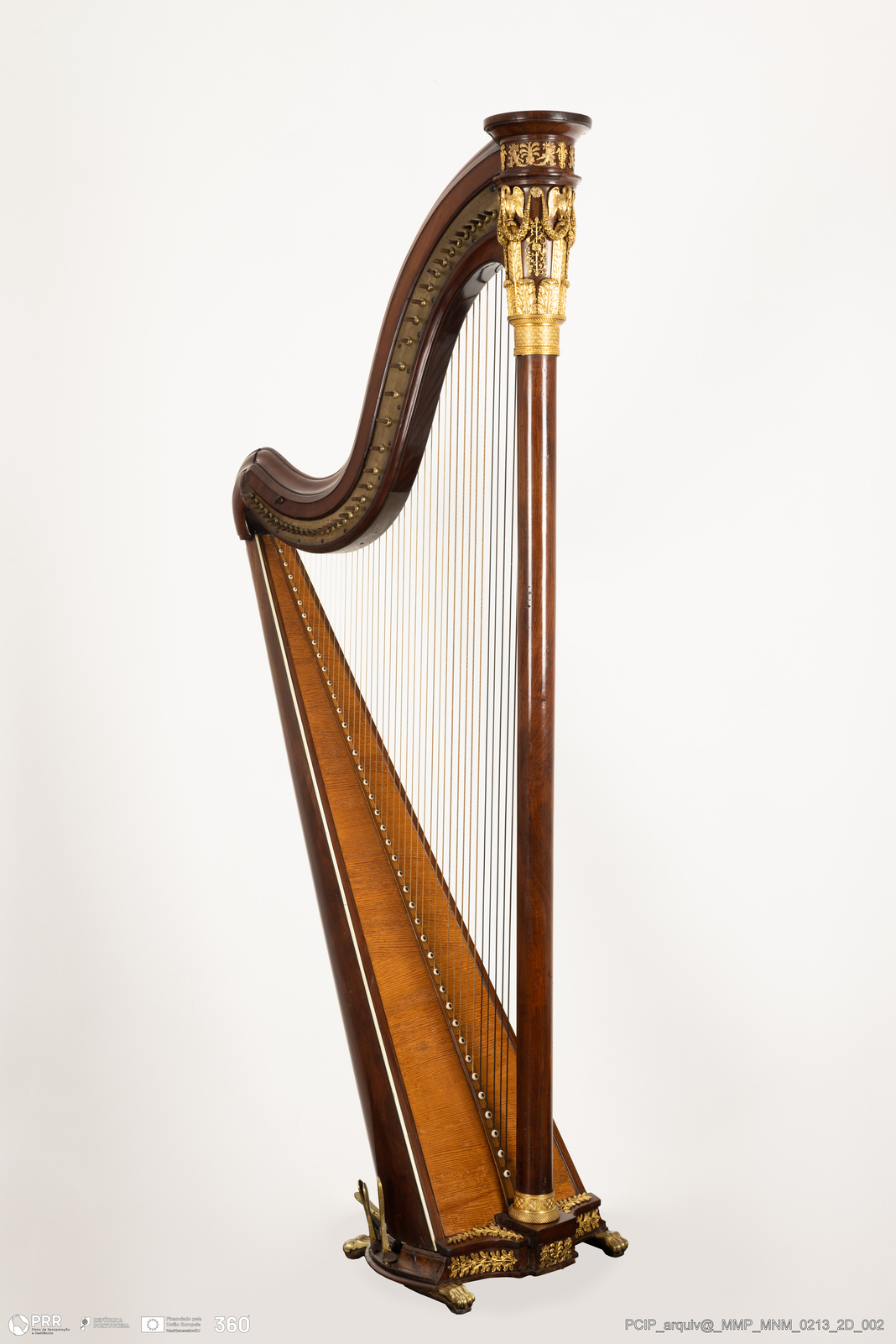 Matéria/Técnica: A Harpa Cousineau tem 41 cordas e 7 pedais a movimento simples. Na época de Louis XIV as harpas ainda não possuíam o mecanismo de pedais, que só apareceram com o alemão Hochbrucke, seu inventor, apesar de Georges Cousineau, o fundador da casa ter aperfeiçoado; Cronologia: Desconhecida; Autoria: Cousineau, Jacques-Georges; Dimensões: Desconhecidas.