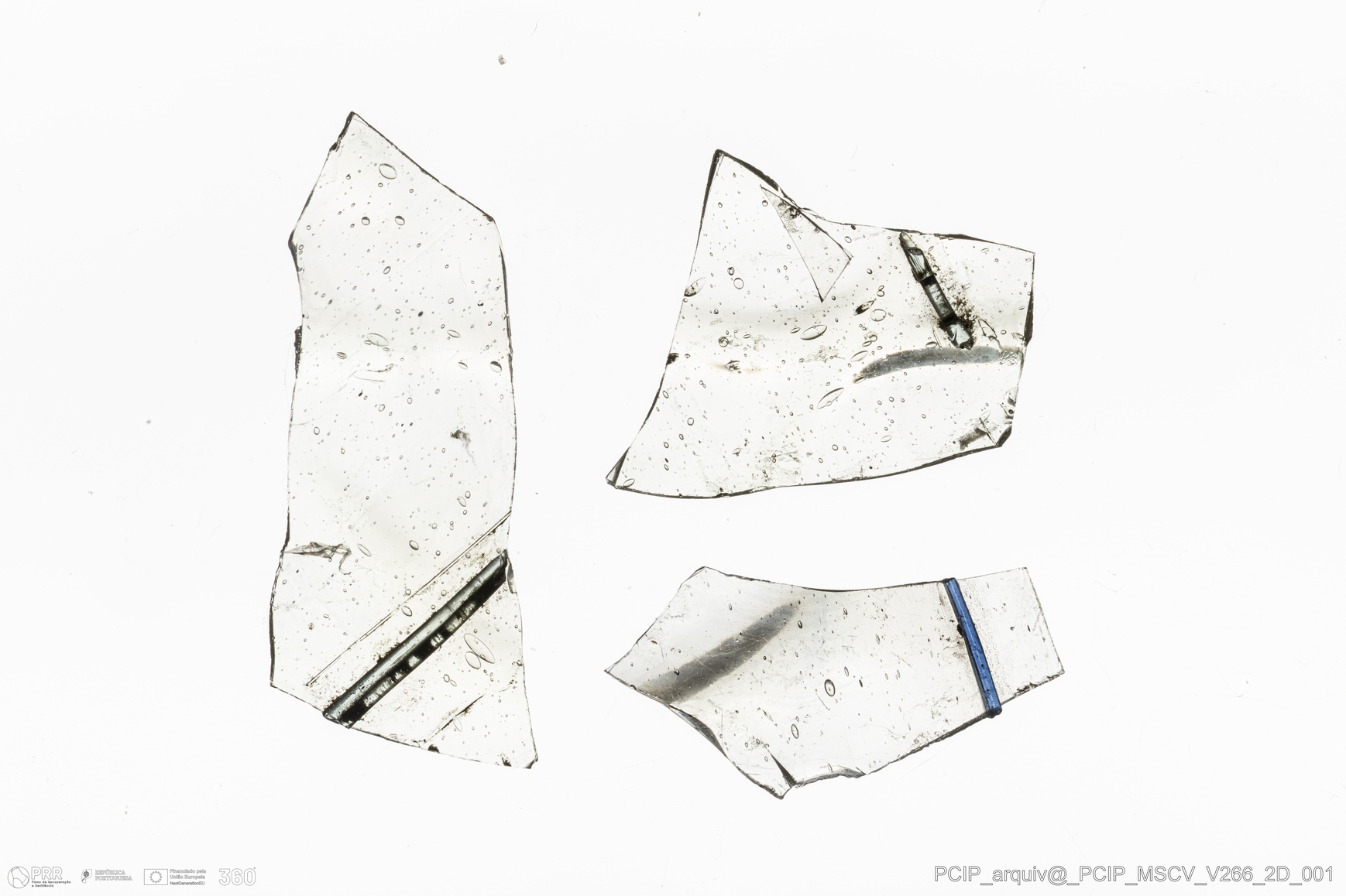 Matéria/Técnica: Vidro; Cronologia: Século XVII; Autoria: Desconhecida; Dimensões: Comprimento: 32mm; Largura: 15mm.
