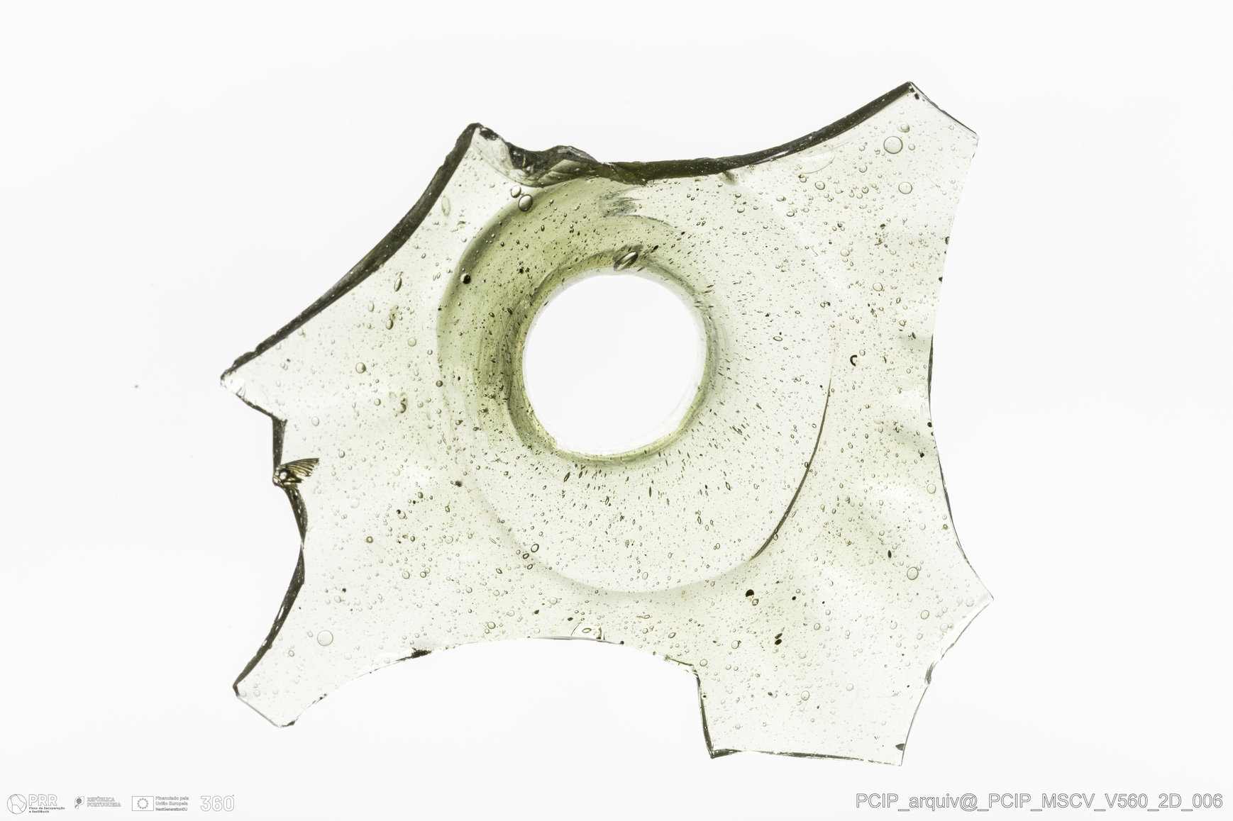 Matéria/Técnica: Vidro; Cronologia: Século XVII; Autoria: Desconhecida; Dimensões: comprimento: 75mm; Largura: 37mm.