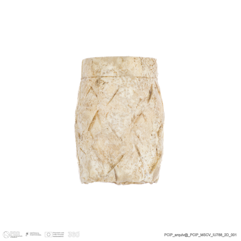Matéria/Técnica: Osso; Cronologia: Século XVII; Autoria: Desconhecida; Dimensões: comprimento: 21mm; Largura: 15mm.