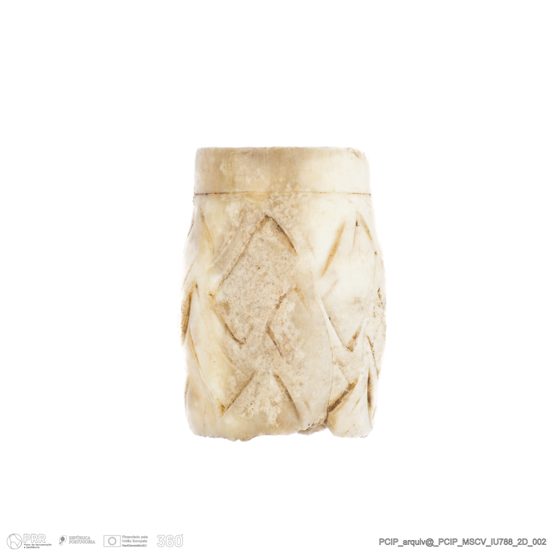 Matéria/Técnica: Osso; Cronologia: Século XVII; Autoria: Desconhecida; Dimensões: comprimento: 21mm; Largura: 15mm.