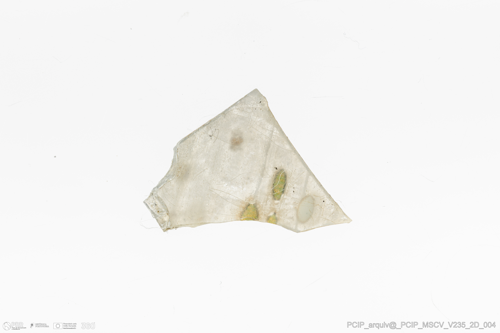 Matéria/Técnica: Vidro; Cronologia: Século XVII; Autoria: Desconhecida; Dimensões: Comprimento: 17mm; Largura: 15mm.