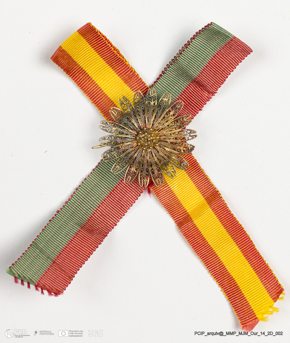 Matéria/Técnica: Filigrana ouro e seda; Cronologia: Desconhecida; Autoria: Desconhecida; Dimensões: Diâmetro: 31 cm.