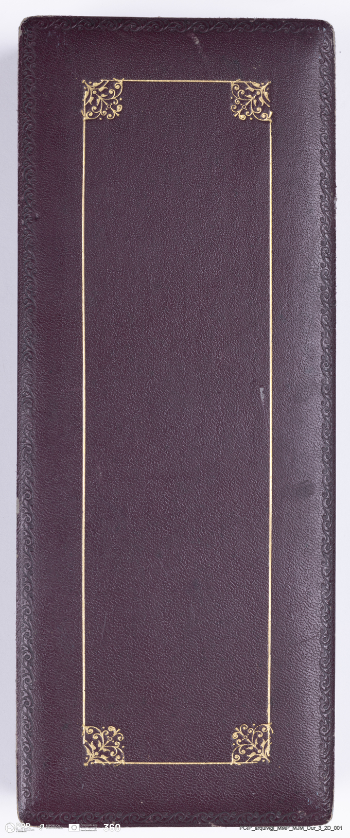 Matéria/Técnica: Prata dourada, esmalte e e seda; Cronologia: Desconhecida; Autoria: Frederico Costa; Dimensões: 9 x 4,4 - placa 3,5 x 2,6 cm.