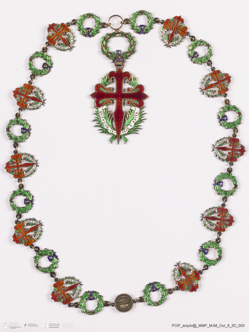 Matéria/Técnica: Ouro e esmalte e; Cronologia: 1956; Autoria: Frederico Costa; Dimensões: 11,5 x 5,2 - perímetro colar 7,4 cm.