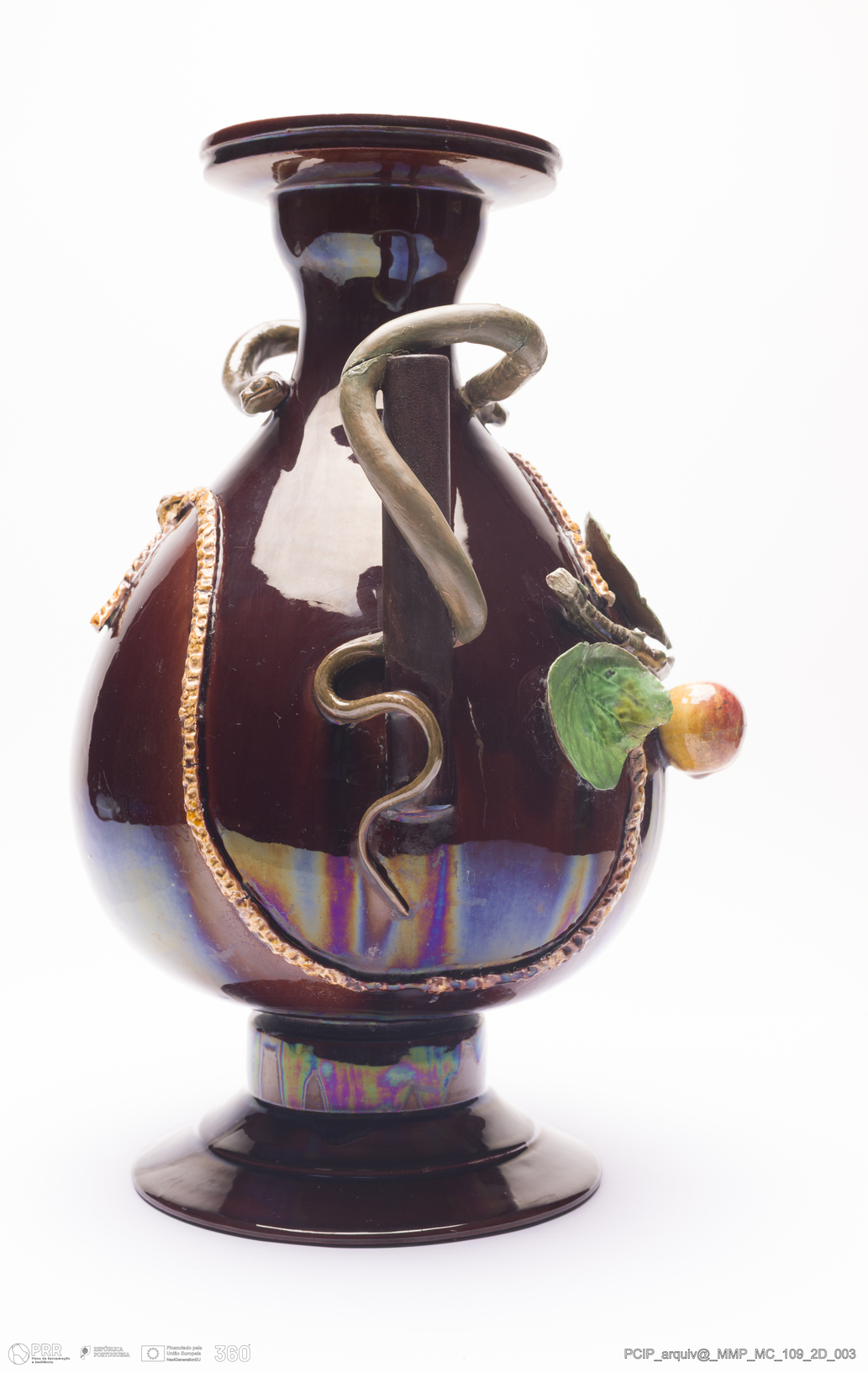 Matéria/Técnica: Barro vermelho rodado, moldado e modelado. Vidrado polícromo: castanho, verde e amarelo; Cronologia: 1895; Autoria: Rafael Bordalo Pinheiro / Fábrica De Faianças Bordalo Pinheiro, Caldas da Rainha, Portugal; Dimensões (cm): Altura: 37; Largura: 28.