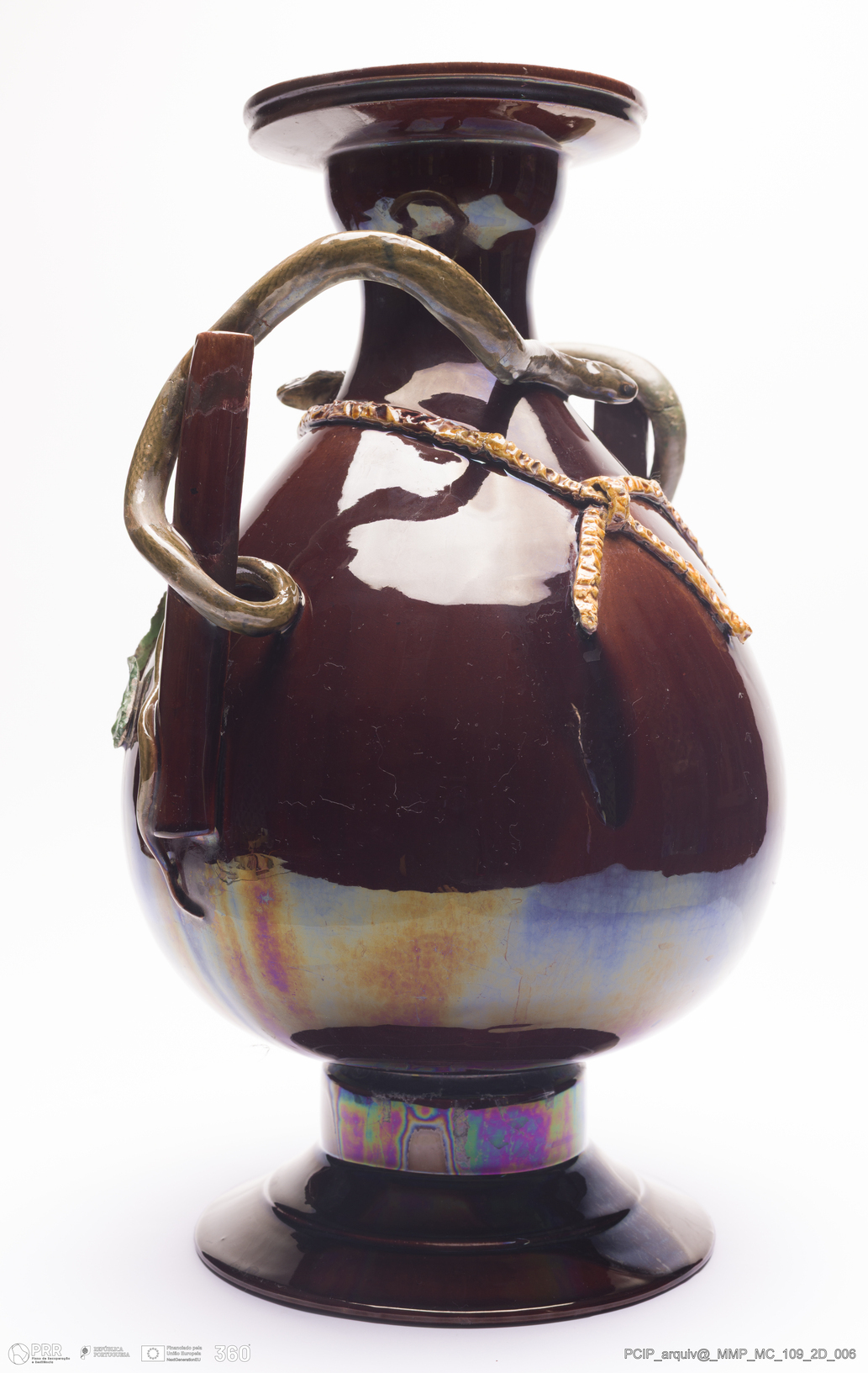 Matéria/Técnica: Barro vermelho rodado, moldado e modelado. Vidrado polícromo: castanho, verde e amarelo; Cronologia: 1895; Autoria: Rafael Bordalo Pinheiro / Fábrica De Faianças Bordalo Pinheiro, Caldas da Rainha, Portugal; Dimensões (cm): Altura: 37; Largura: 28.