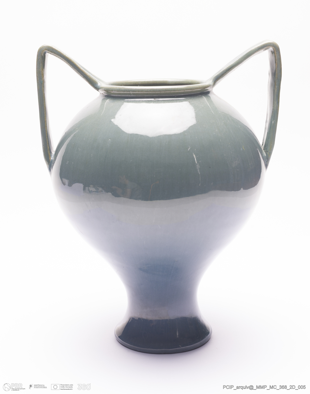 Matéria/Técnica: Barro vermelho moldado e modelado. Vidrado monocromo verde claro; Cronologia: século XX; Autoria: Desconhecido / Atribuído à Fábrica de Faianças das Caldas da Rainha, Portugal; Dimensões (cm): Altura: 23; Diâmetro: 18,2.