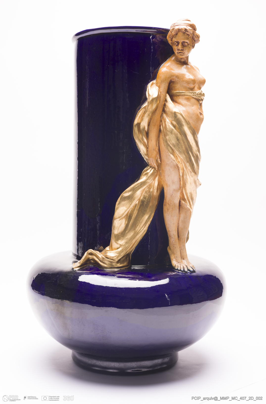 Matéria/Técnica: Barro rodado e moldado. Vidrado a azul cobalto e pintura a frio; Cronologia: 1892-1896; Autoria: Desconhecido / Atelier Cerâmico, Caldas da Rainha, Portugal; Dimensões (cm): Altura: 41,5; Largura: 24.