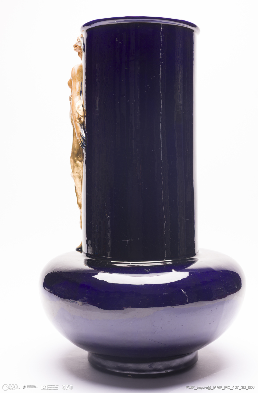 Matéria/Técnica: Barro rodado e moldado. Vidrado a azul cobalto e pintura a frio; Cronologia: 1892-1896; Autoria: Desconhecido / Atelier Cerâmico, Caldas da Rainha, Portugal; Dimensões (cm): Altura: 41,5; Largura: 24.