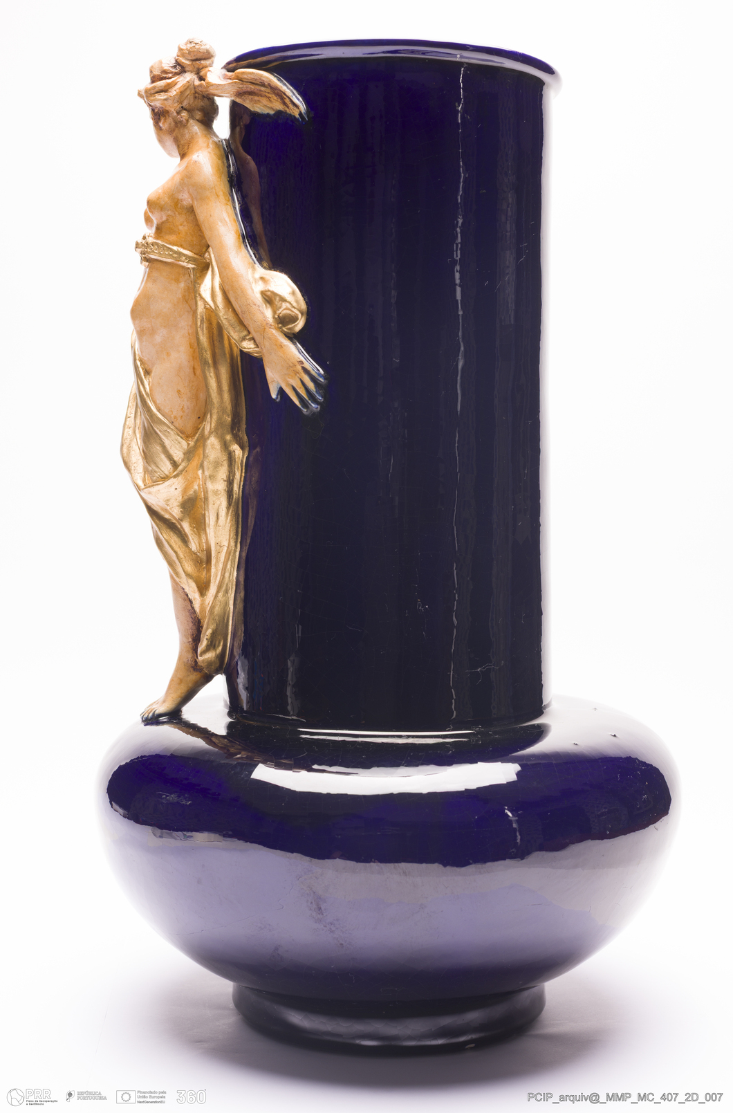 Matéria/Técnica: Barro rodado e moldado. Vidrado a azul cobalto e pintura a frio; Cronologia: 1892-1896; Autoria: Desconhecido / Atelier Cerâmico, Caldas da Rainha, Portugal; Dimensões (cm): Altura: 41,5; Largura: 24.