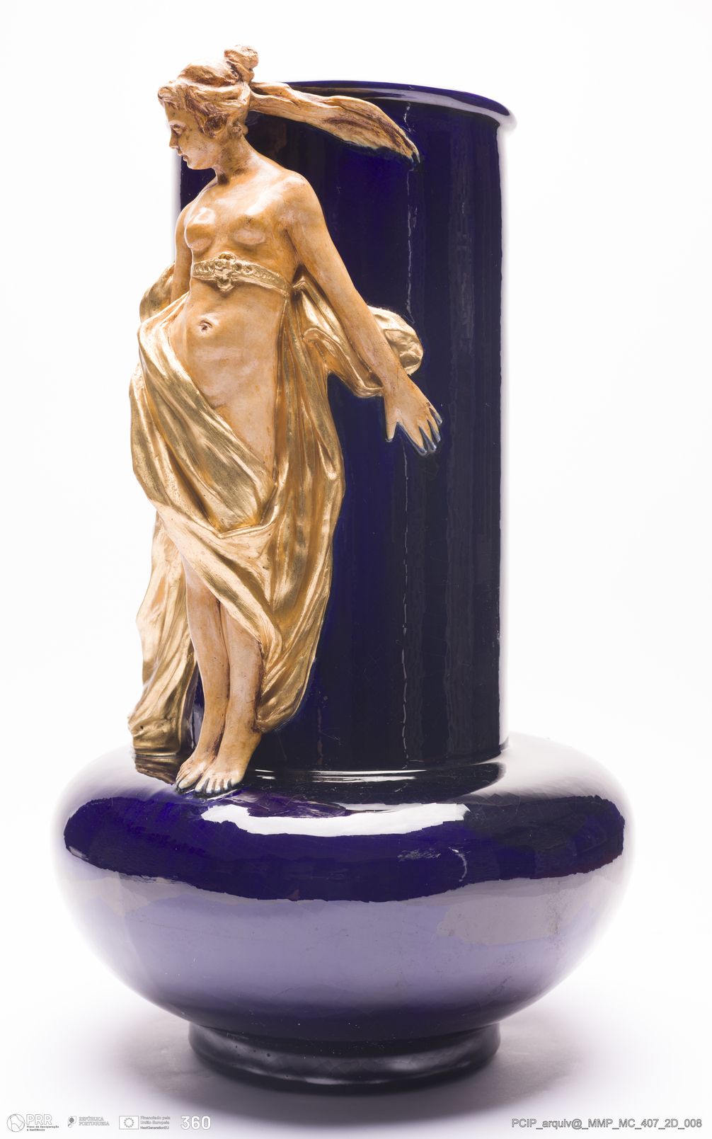 Matéria/Técnica: Barro rodado e moldado. Vidrado a azul cobalto e pintura a frio; Cronologia: 1892-1896; Autoria: Desconhecido / Atelier Cerâmico, Caldas da Rainha, Portugal; Dimensões (cm): Altura: 41,5; Largura: 24.