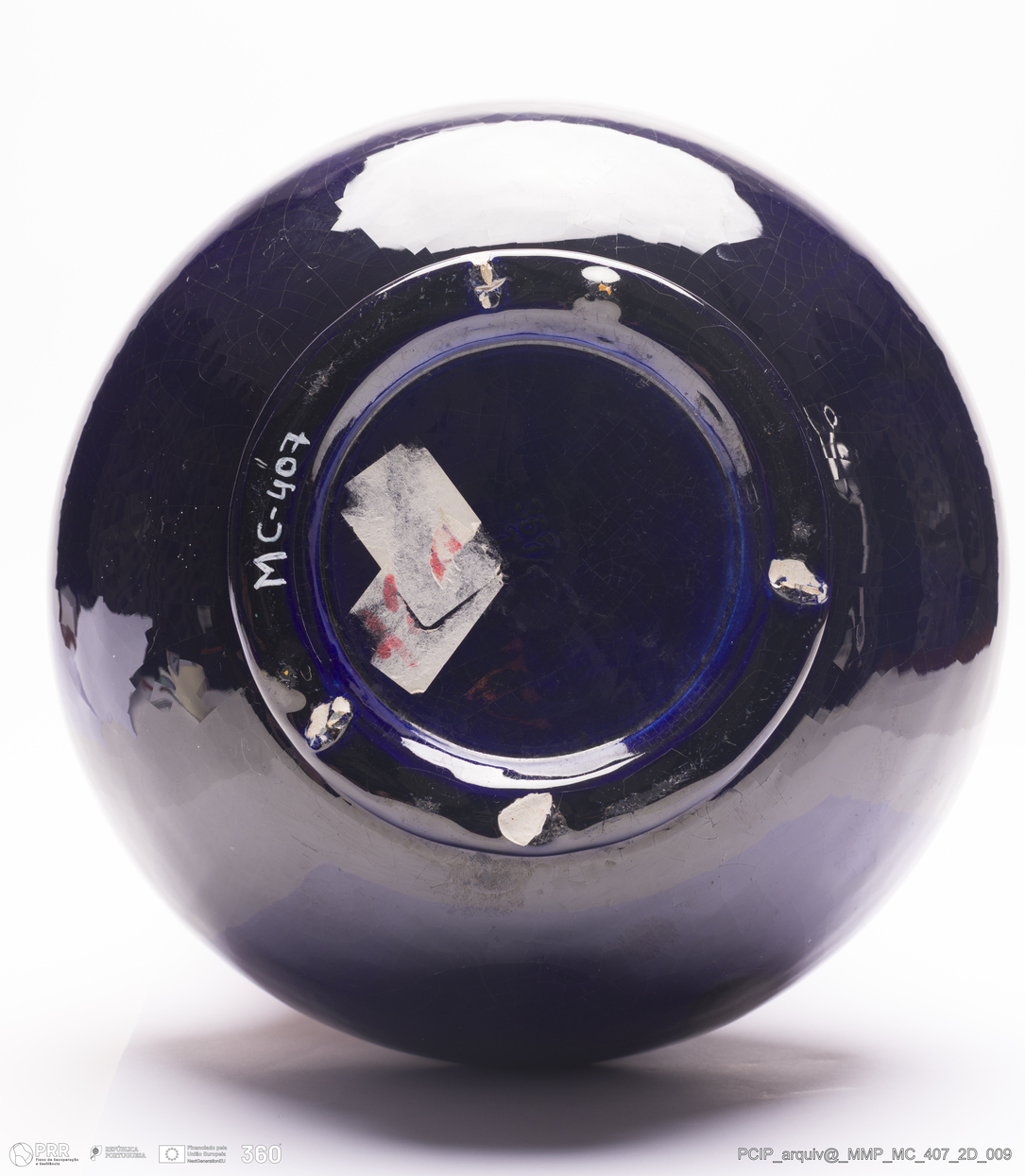 Matéria/Técnica: Barro rodado e moldado. Vidrado a azul cobalto e pintura a frio; Cronologia: 1892-1896; Autoria: Desconhecido / Atelier Cerâmico, Caldas da Rainha, Portugal; Dimensões (cm): Altura: 41,5; Largura: 24.
