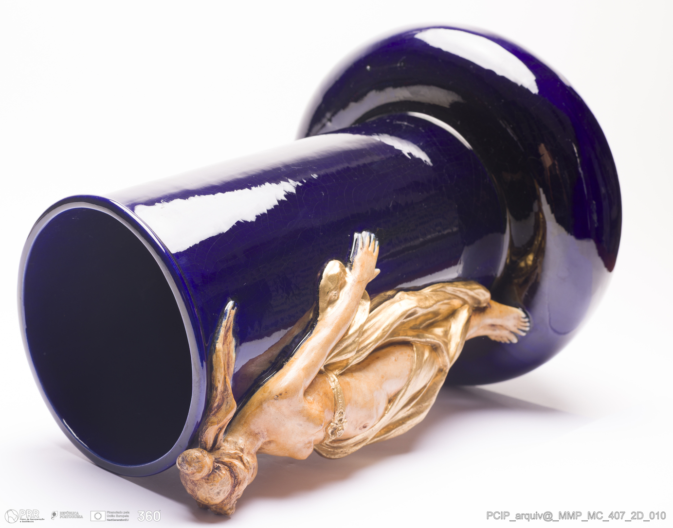 Matéria/Técnica: Barro rodado e moldado. Vidrado a azul cobalto e pintura a frio; Cronologia: 1892-1896; Autoria: Desconhecido / Atelier Cerâmico, Caldas da Rainha, Portugal; Dimensões (cm): Altura: 41,5; Largura: 24.