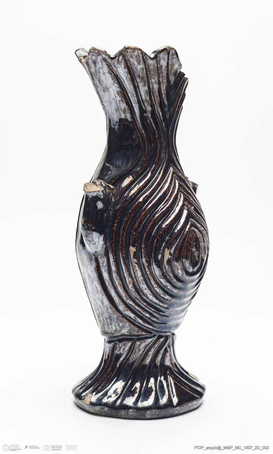 Matéria/Técnica: Barro vermelho moldado. Vidrado castanho escuro; Cronologia: 1862; Autoria: Manuel Cipriano Gomes Mafra / Caldas da Rainha; Dimensões (cm): Altura: 21; Largura: 8; Comprimento: 9,5.
